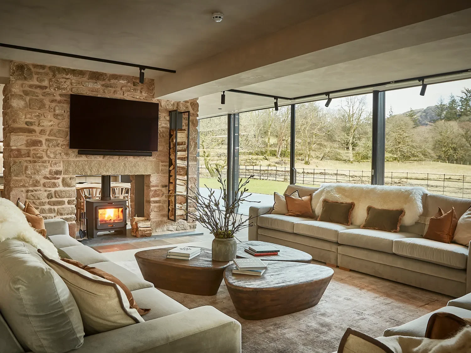- Our private retreat space includes indoor and outdoor movement spaces, Large open plan lounge dining room with stunning panoramic views, Log Burning Stoves, Media Snug Room, Outdoor Terrace and Firepit